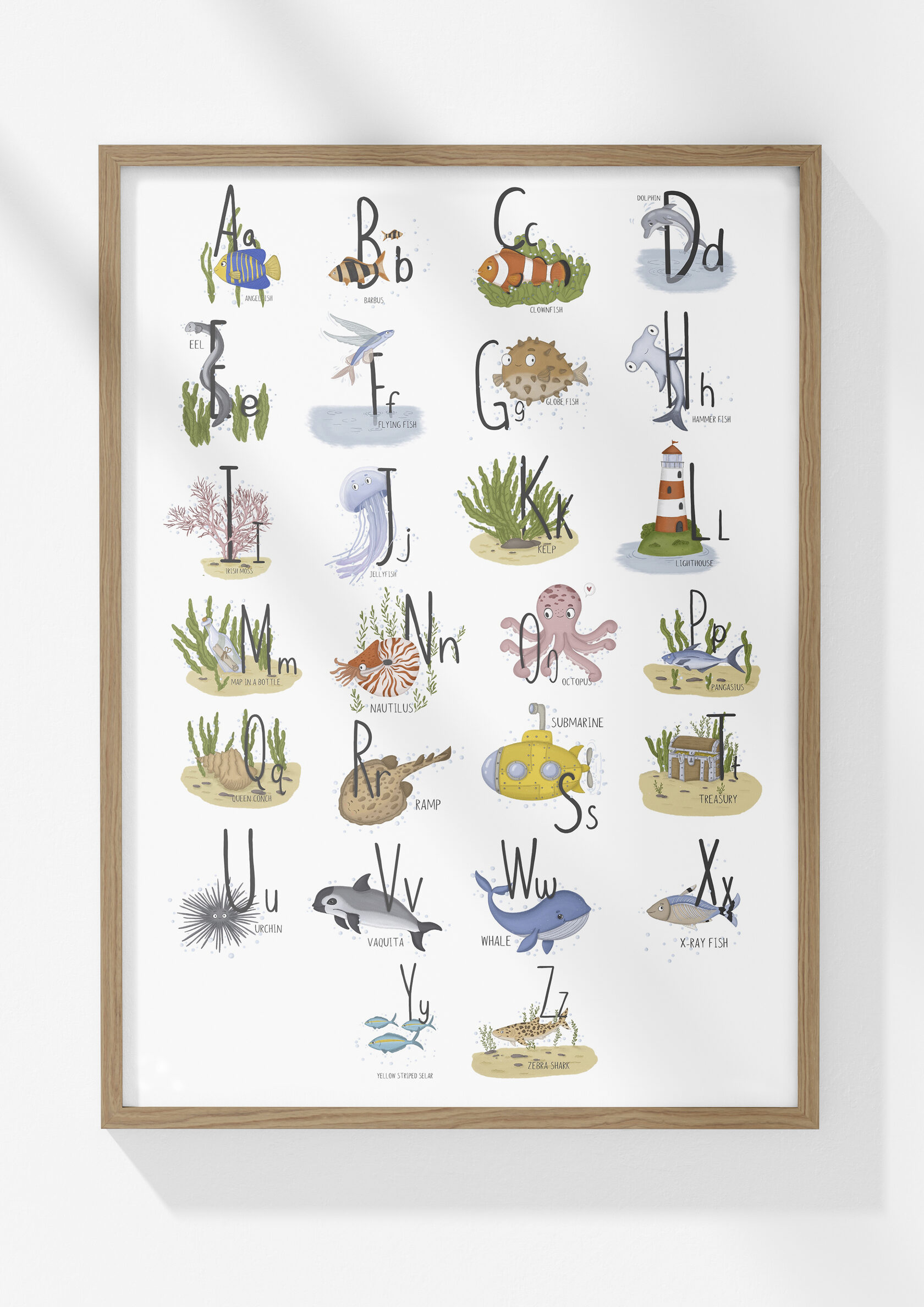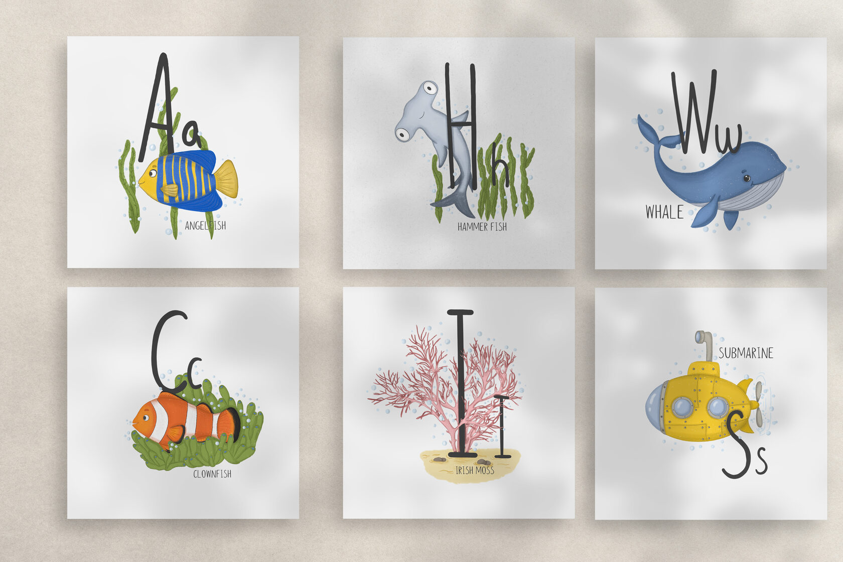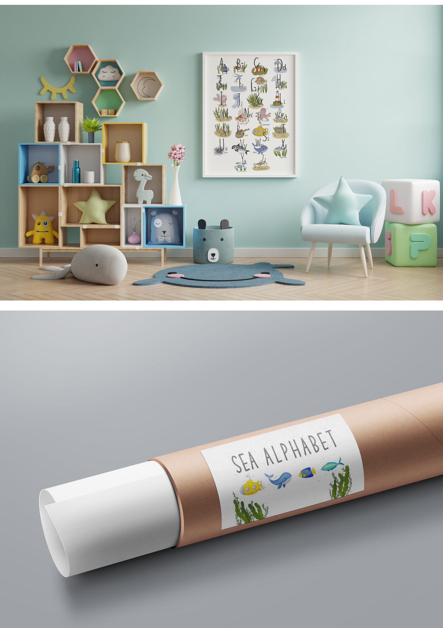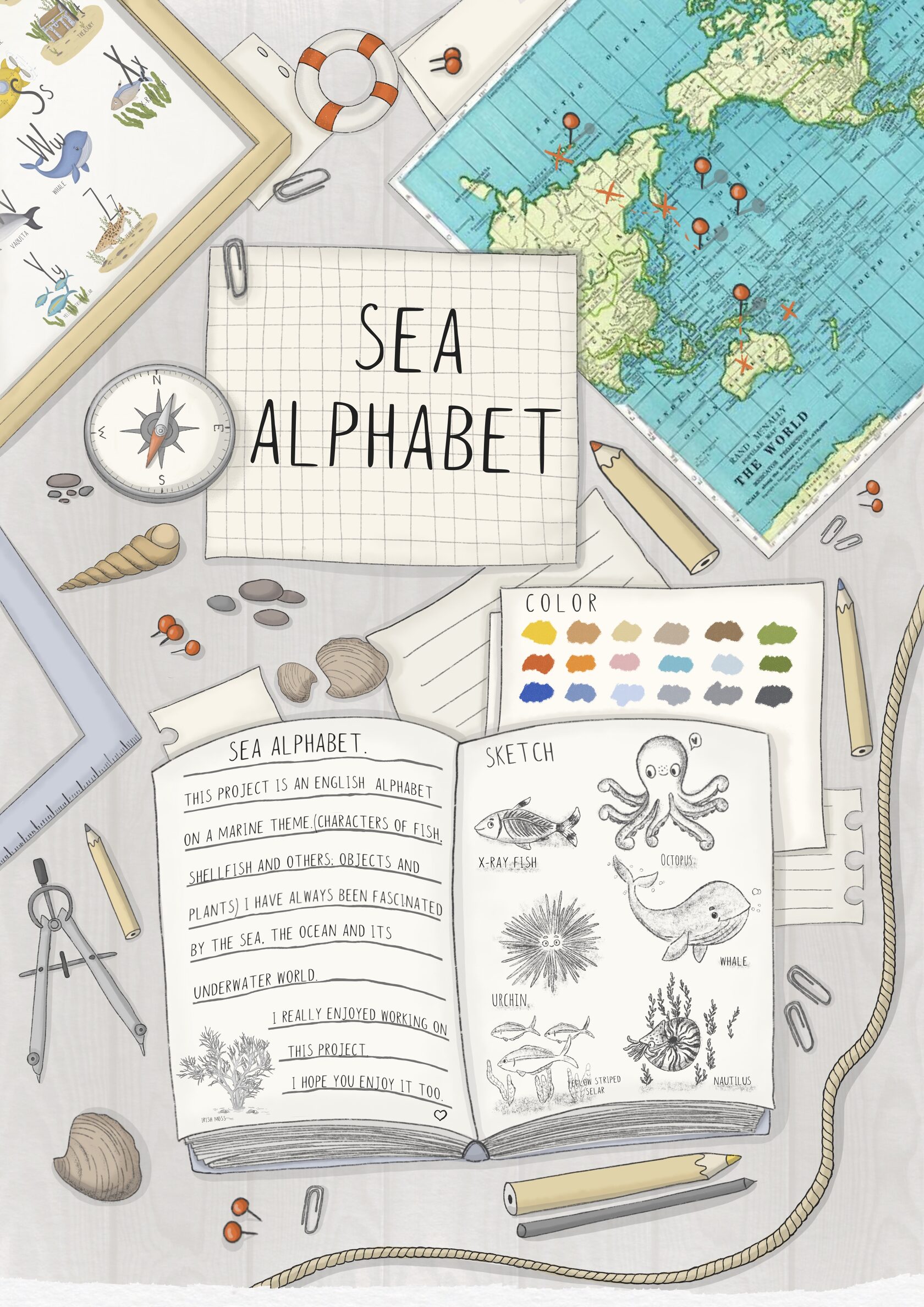 In this project, it was necessary to depict cute marine characters and marine objects (algae, plants, shells, etc.). Add a little atmosphere of mystery and sea adventures The alphabet is printed as a poster on the wall in the nursery, looks good and in the form of cards for learning English books and words.